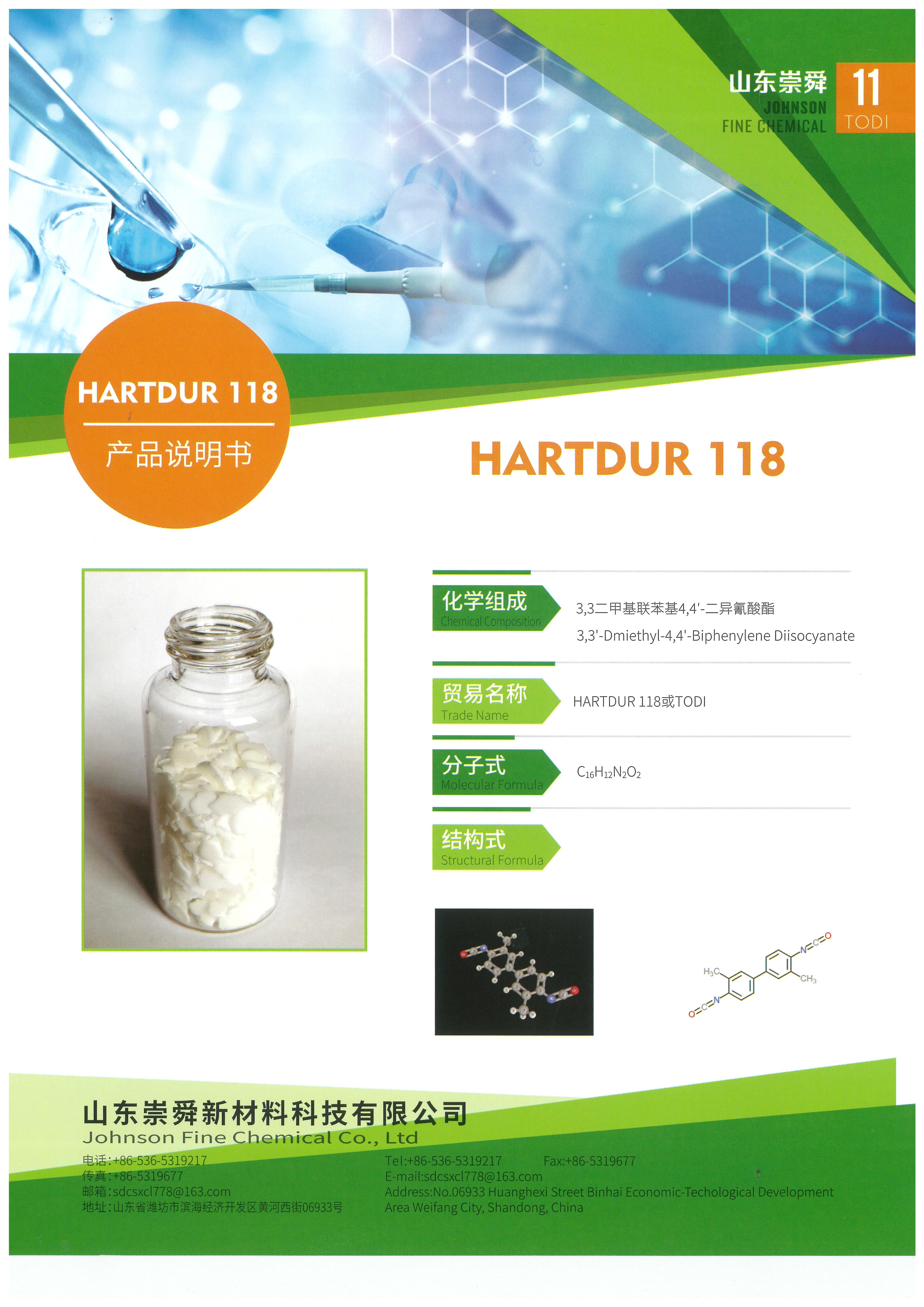 HARTDUR 118 (TODI) 是纯度极高的 3,3'-二甲基-4,4'-联苯二异氰酸酯,以乳白色或浅黄色粒状固体。在室温下,蒸汽压低于10-4mbar。建议工作场所空气中允许的浓度为 0.01 ppm = 0.087 mg/m3。即使是短时间也不应超过该值。由于具有特殊的反应性,TODI 必须被视为危险物并且小心处理。