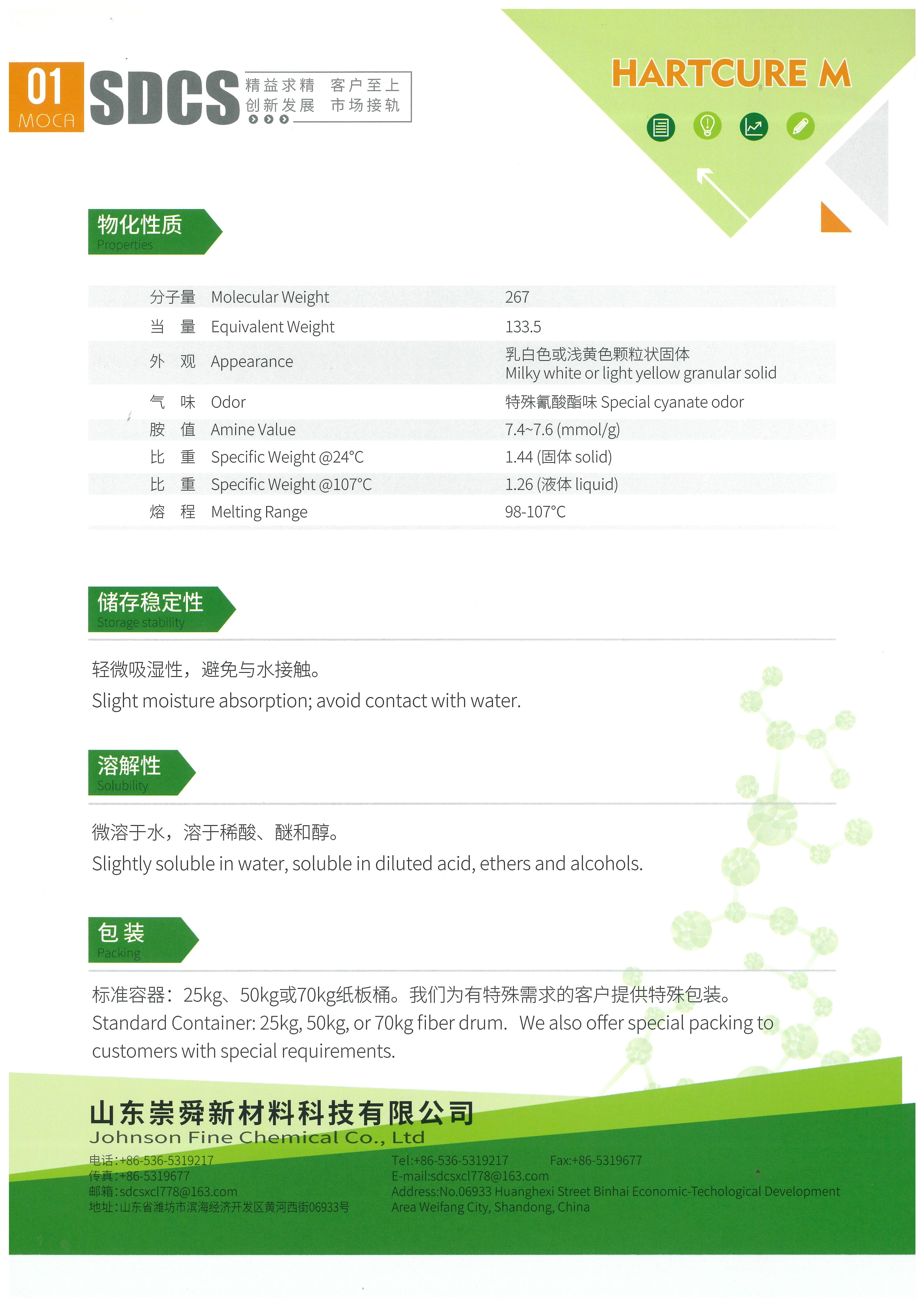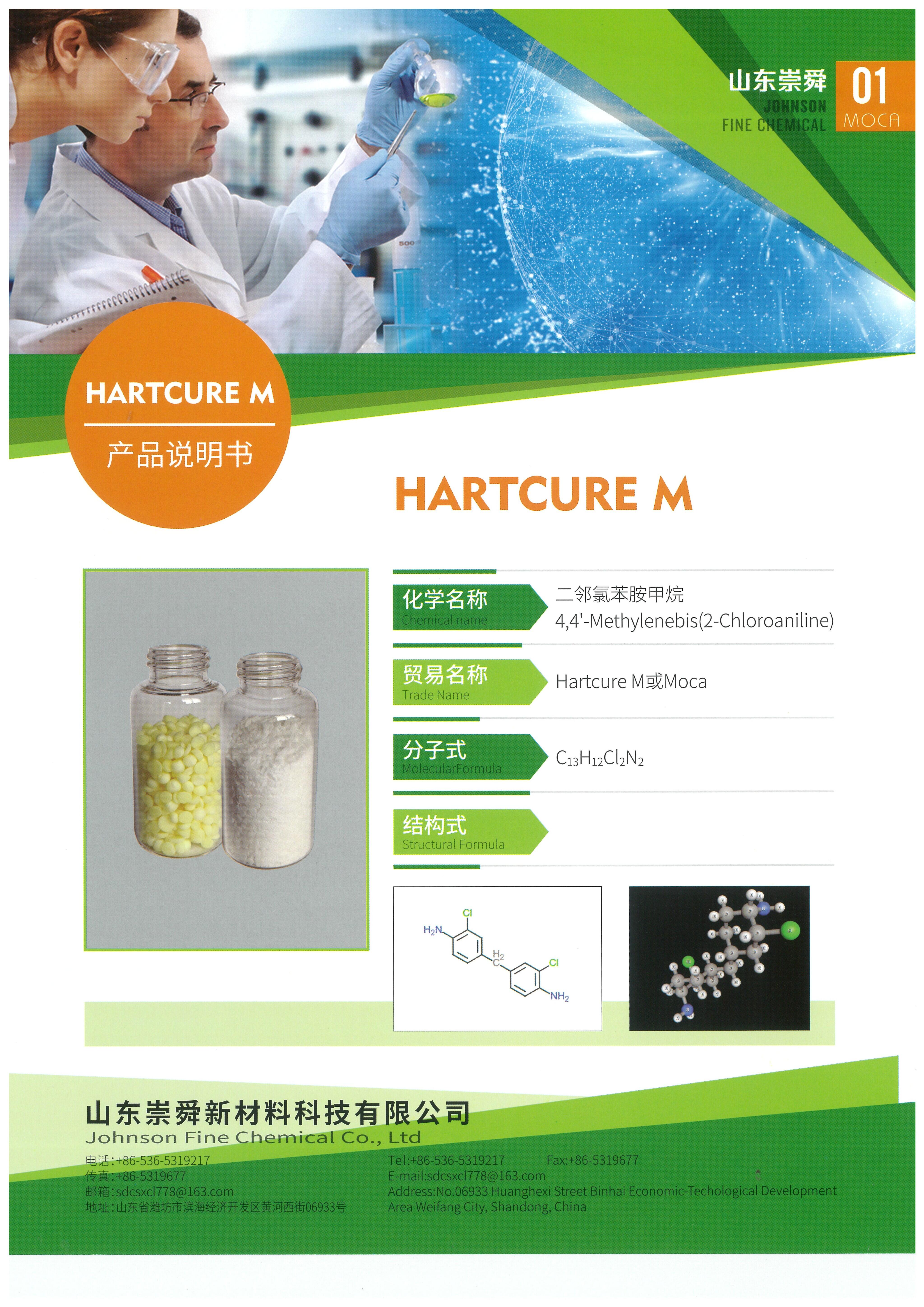 HARTCURE M,通称MOCA为一种硬化剂及扩链剂广泛应用于聚氨酯制品中,尤其适用于浇铸聚氨酯弹性体 (Casting PU Elastomer)。 HARTCURE M (MOCA) 在高温下具有优良的颜色稳定性,而使用HARTCURE M (MOCA)制成的聚氨酯弹性体可容许在摄氏100度以上的高温环境稳定运作。 同时,此种聚氨酯弹性体还具备良好的耐磨、耐化、耐拉伸、抗撕裂、耐冲击、吸震防震等特性。
