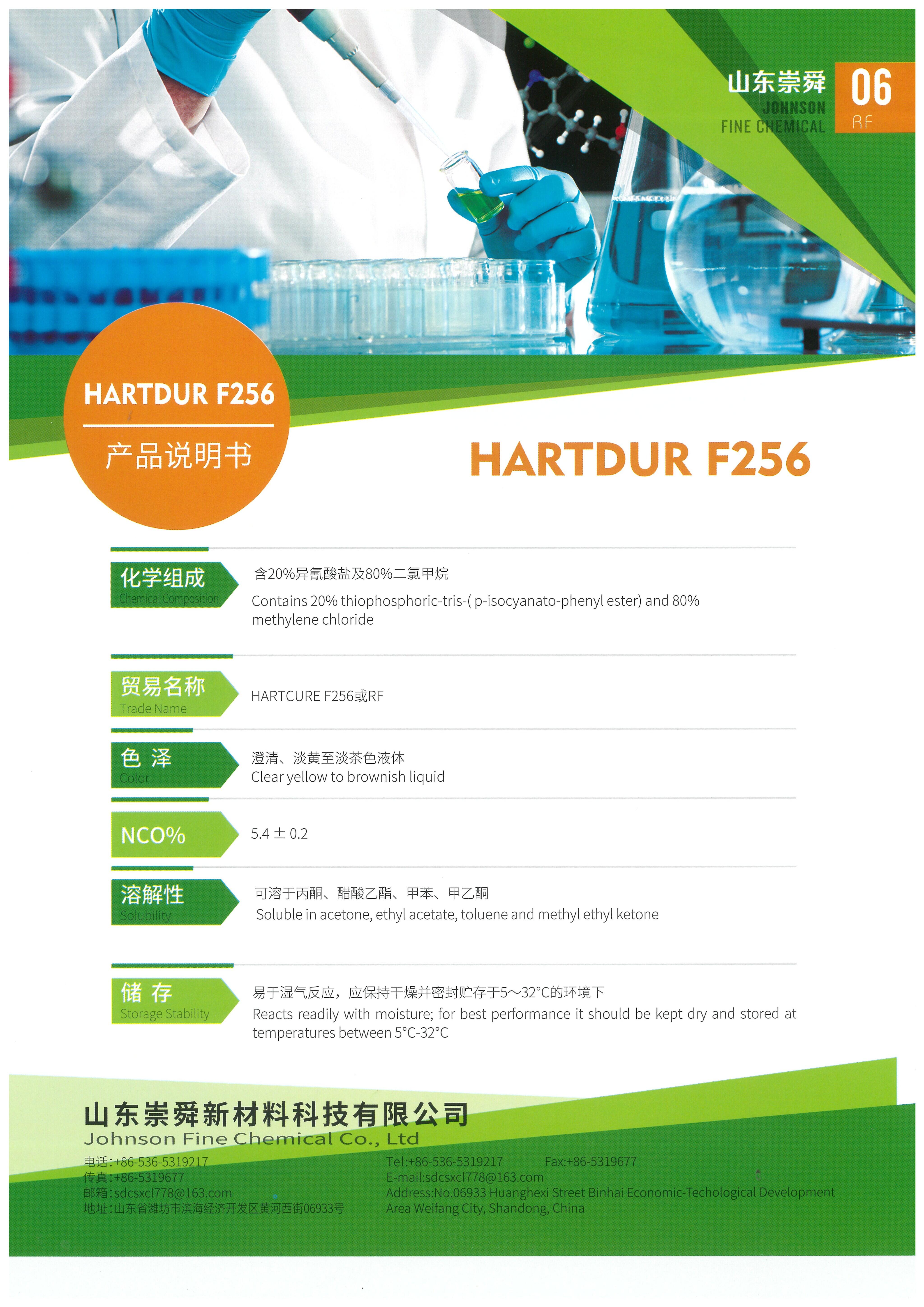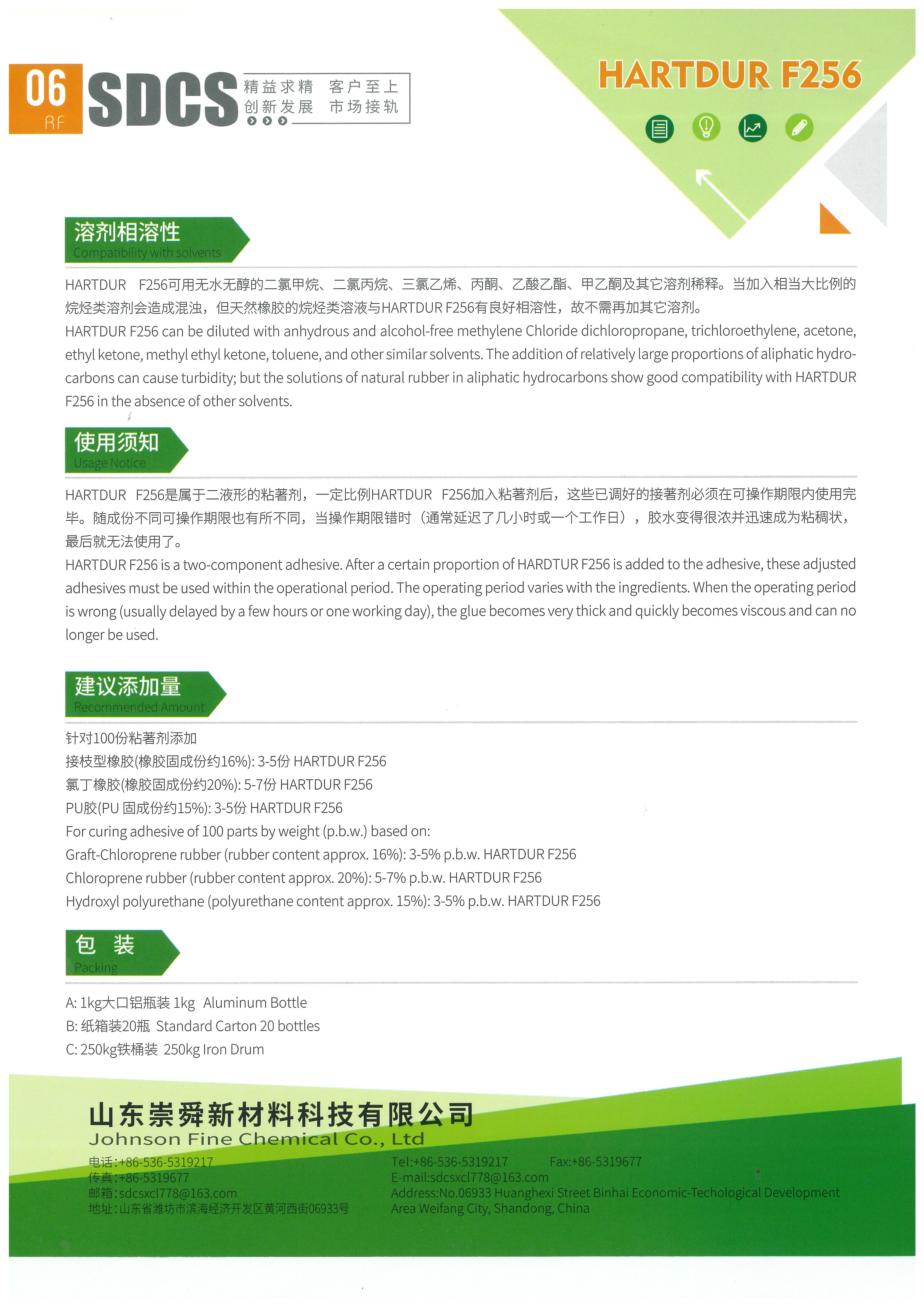 Hartdur F256 为双组分黏着剂之架桥剂。在黏着剂中加入一定比例的 Hardtur F256 后,混合后的双组分黏着剂应在适用期(Pot Life)内施作,这不仅受其橡胶含量的影响,Hartdur F256 的添加量不仅取决于黏着剂其橡胶含量,还取决于其他成分配方(例如树脂、抗氧化剂、溶剂等)的比例。如果未在操作时间内使用黏着剂,它将会变得越来越难以涂抹,且粘度会迅速增加,直到最终出现凝胶/胶体,届时已无法使用。