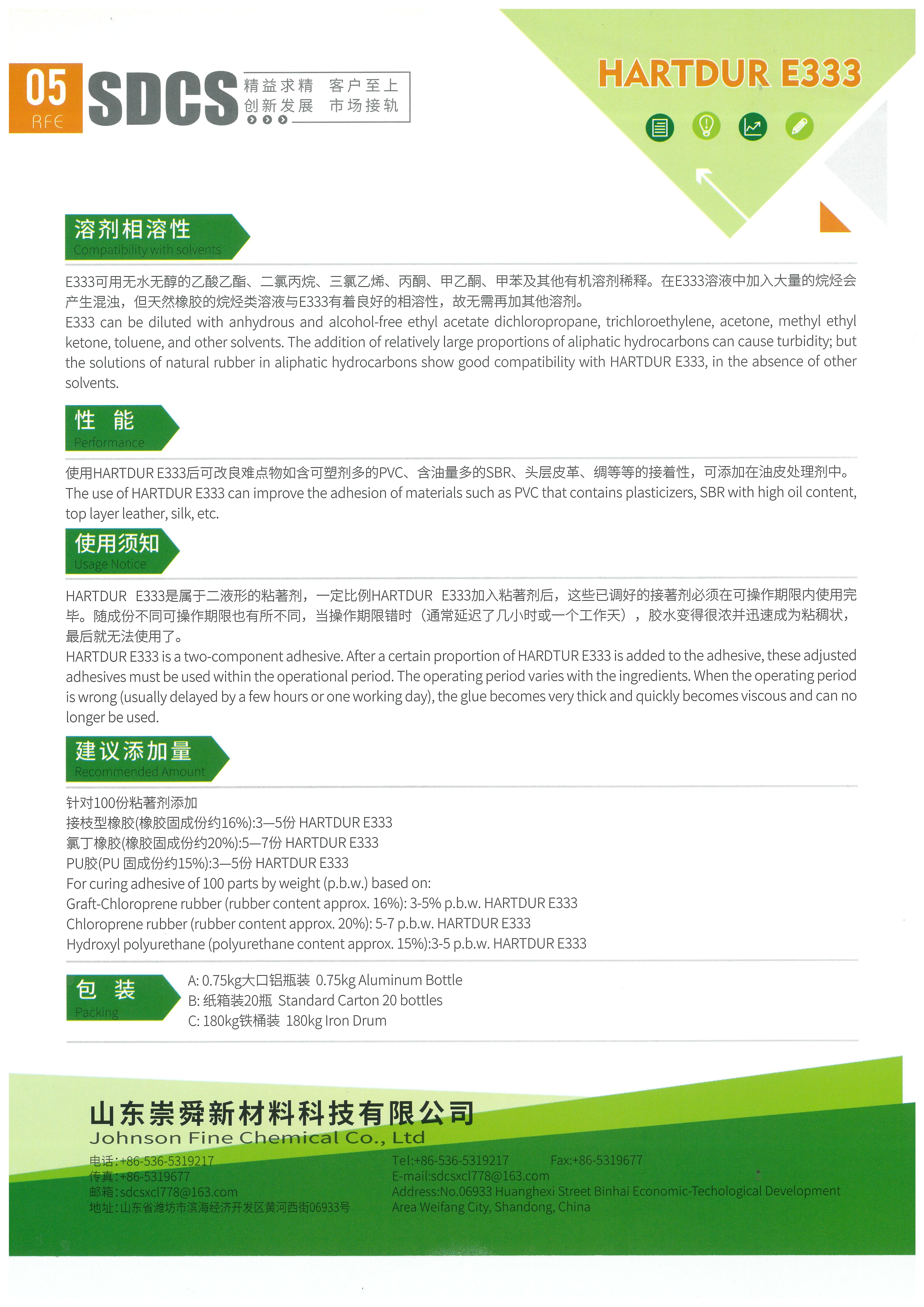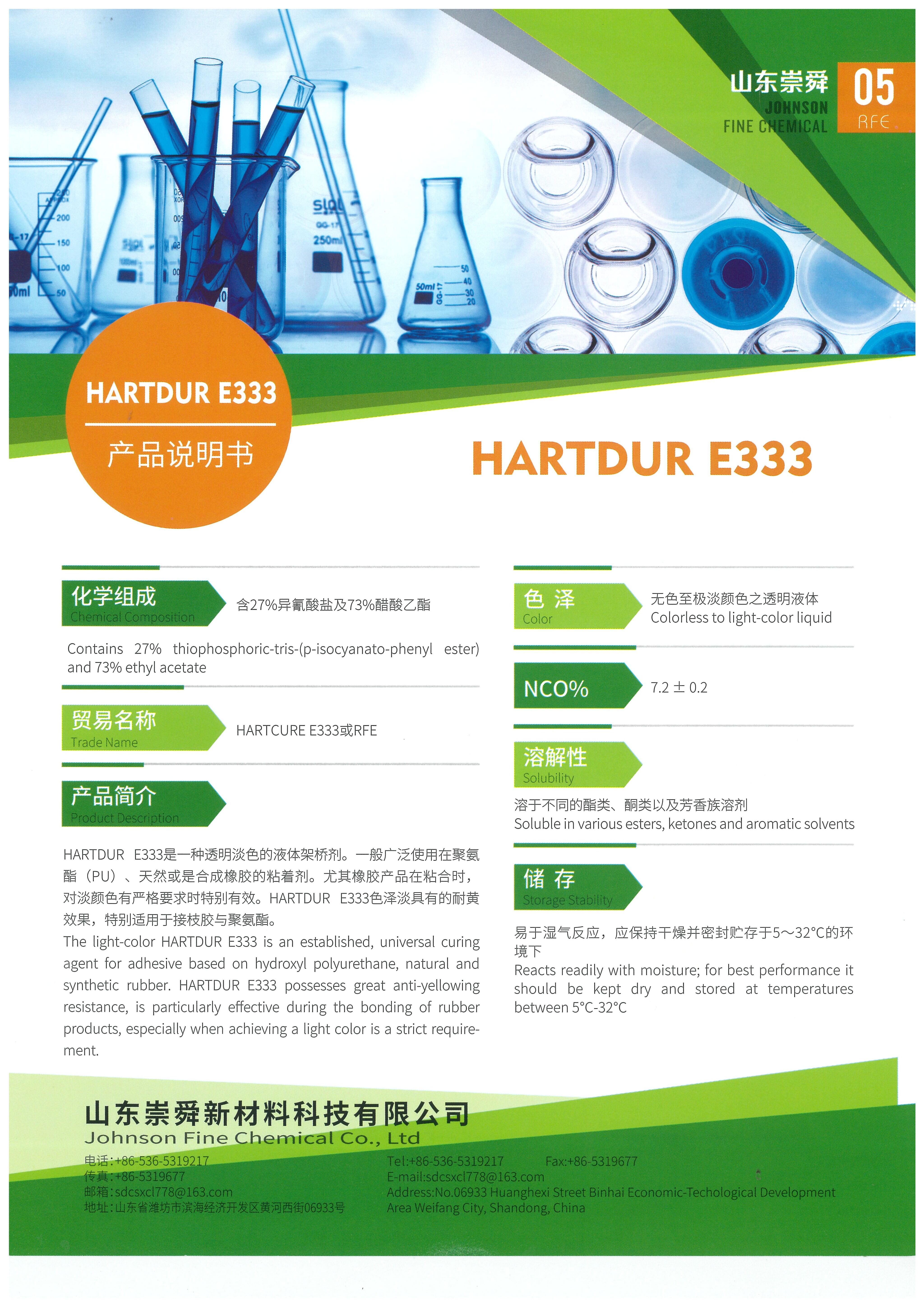 HARTDUR E333 (RFE / TPTI) 是一种通用型异氰酸酯交联剂,适用于聚氨酯、天然和合成橡胶等材料的黏合剂。 HARTDUR E333 具有优异的耐热性和耐溶剂性,在橡胶制品的黏合过程中特别有效,特别是在对浅色外观有严格要求的情况下。