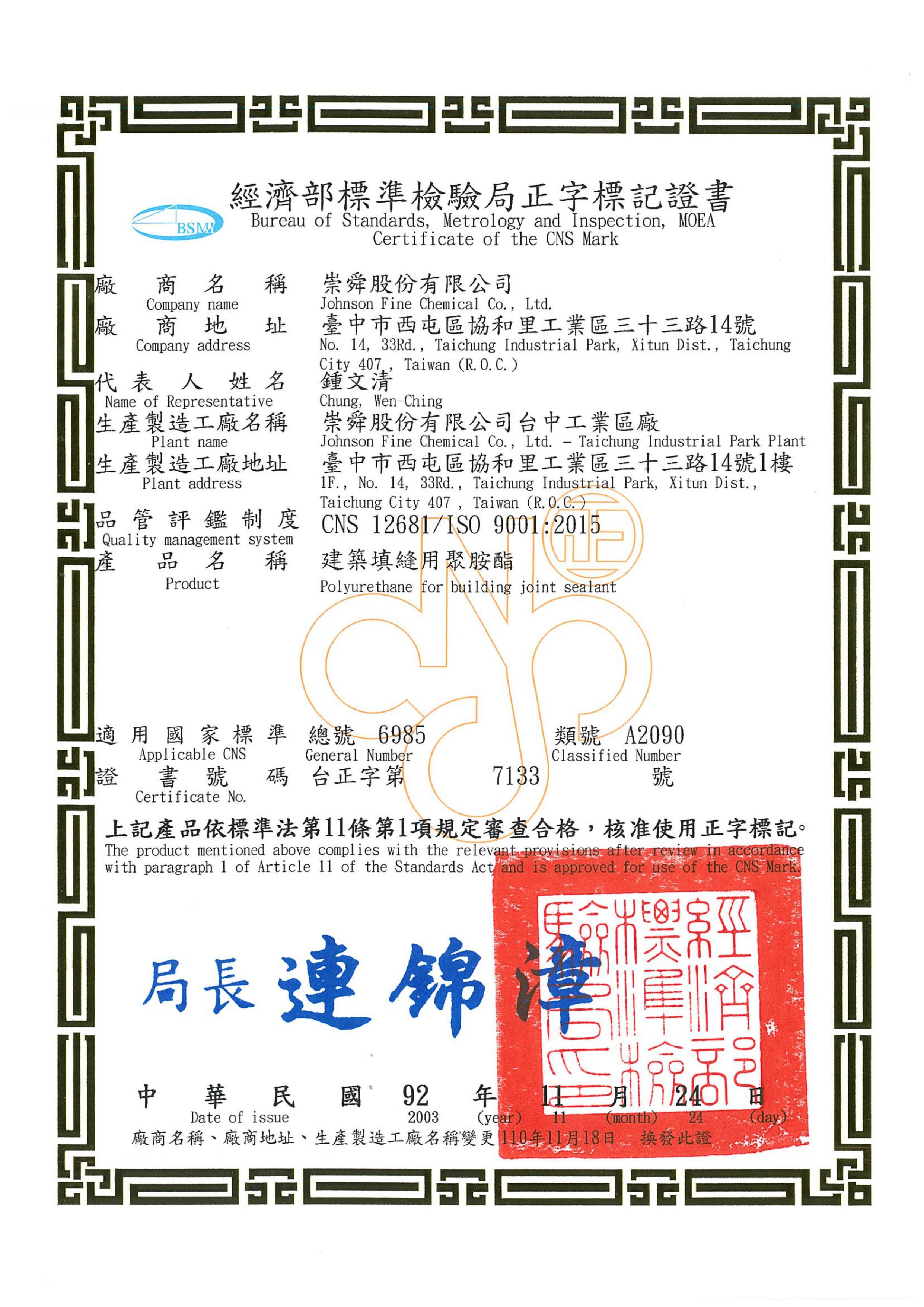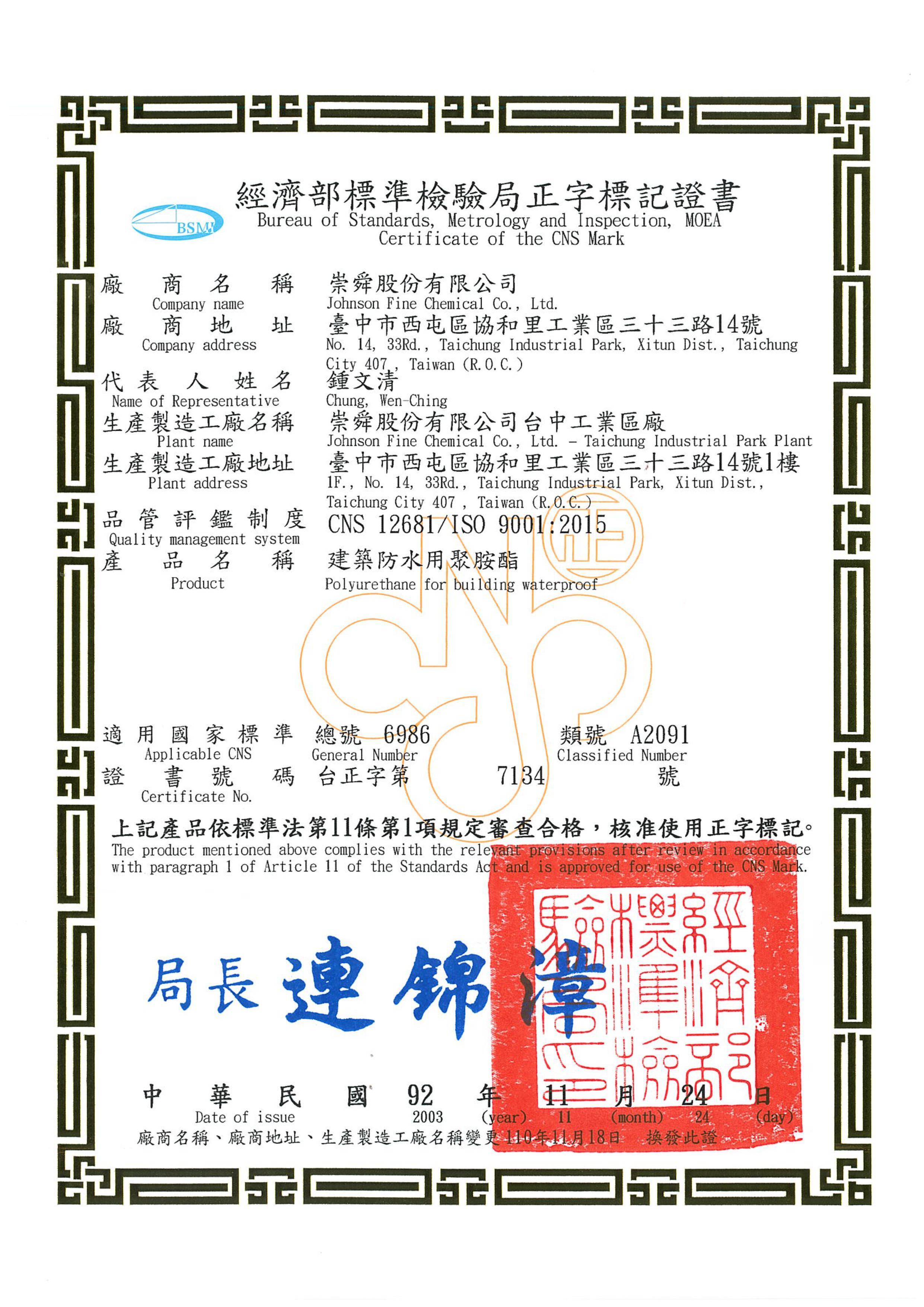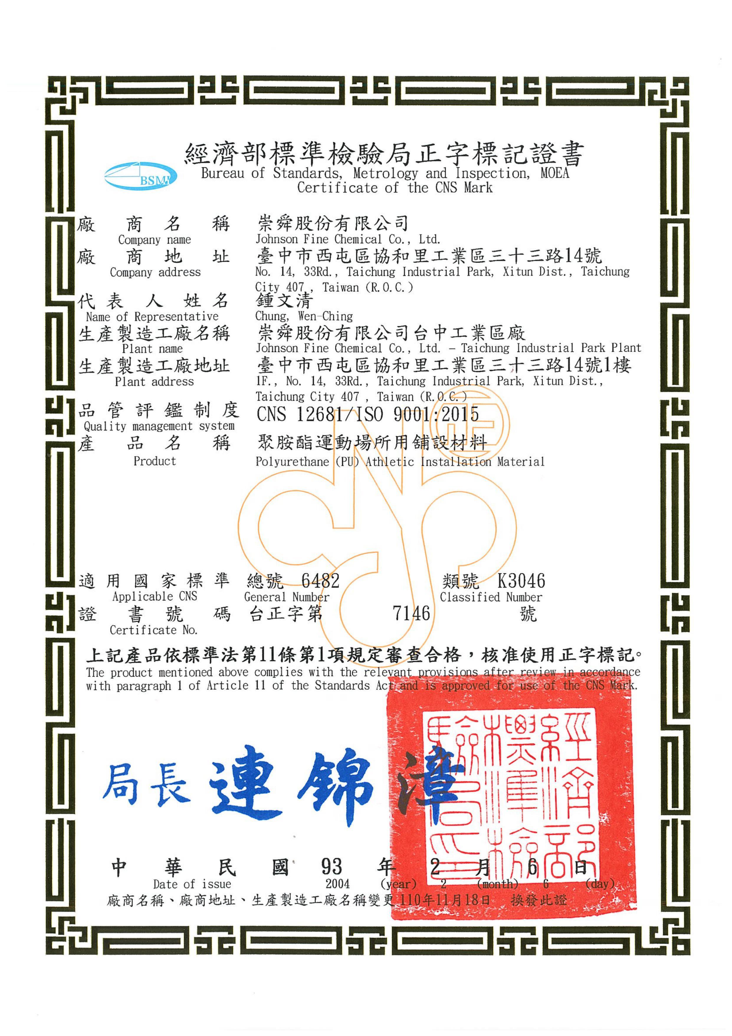 致力于提供客户最优质的产品,崇舜的PU聚胺酯树脂涂料符合中华民国国家标准(CNS),身为生产制造工厂,本司采行之品质管理符合指定品管制度(CNS 12681/ISO 9001),争取顾客信赖以拓展市场,您也可经由CNS正字标记,简易地选购合宜的优良产品,保障您的权益!